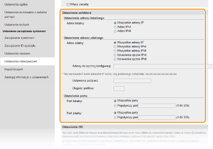 Wybierz tę opcję, aby używać protokołu IPSec w przypadku wszystkich pakietów IP wysyłanych na adres IPv4 urządzenia lub z tego adresu.