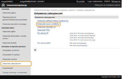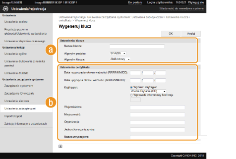 Parę kluczy można wygenerować za pomocą urządzenia, jeśli wymaga tego komunikacja szyfrowana z użyciem protokołu Transport Layer Security (TLS). Z szyfrowania TLS można korzystać podczas udzielania dostępu do urządzenia przez Zdalny interfejs użytkownika. Maksymalnie dla urządzenia można zarejestrować pięć par kluczy.