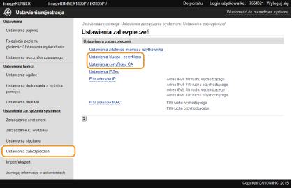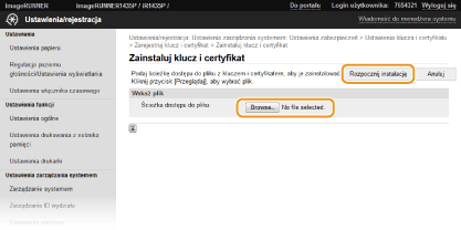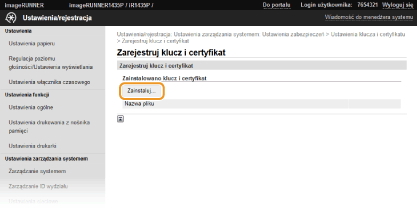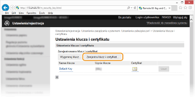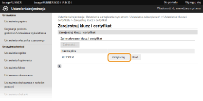Wymagania dotyczące kluczy i certyfikatów). Można zarejestrować maksymalnie pięć par kluczy i 10 certyfikatów CA (w tym pięć zainstalowanych fabrycznie).