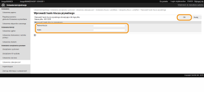 Nie można usunąć pary kluczy, która jest obecnie używana do innych celów, np.: gdy elementy [TLS] lub [IEEE 802.1X] są wyświetlane pod [Użycie klucza]. W takiej sytuacji należy wyłączyć daną funkcję lub zamienić parę kluczy przed jej usunięciem. Nie można usunąć fabrycznie zainstalowanych certyfikatów CA.