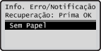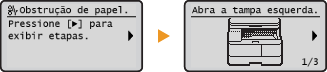Em alguns casos, quando ocorre um erro, aparecem instruções para lidar com o erro. Siga as instruções apresentadas no ecrã para resolver o problema. O ecrã apresentado quando ocorre um encravamento de papel é mostrado abaixo como exemplo (