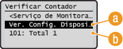 (Verificar contador), aparece o ecrã <Verificar Contador>. A partir deste ecrã, pode ver o valor do contador e o número de série da máquina, bem como a respetiva configuração.