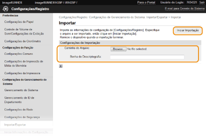 Especifique as definições para importação e clique em [Iniciar Importação].