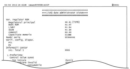 Lista de meniuri de setări) şi setările actuale înregistrate în aparat, precum dimensiunea şi tipul hârtiei.. Puteţi verifica şi informaţiile despre setări pentru <Setări reţea> şi <Setări administrare sistem> care nu sunt incluse în lista date utilizator (