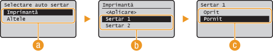 Activaţi sau dezactivaţi funcţia de selectare automată a sertarului pentru sursele de hârtie. Dacă selectarea automată a sertarului de hârtie este setată la <Pornit> când imprimaţi documente, aparatul selectează automat o sursă de hârtie care conţine dimensiunea de hârtie specificată. De asemenea, când se termină hârtia, această setare permite continuarea imprimării prin trecerea de la o sursă de hârtie la alta care conţine acelaşi tip de hârtie.