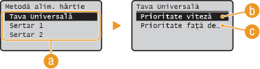 <Tavă universală> nu este afişat dacă aţi selectat <Imprimantă> pe ecranul precedent (
