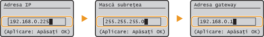 <Mască subreţea> <Adresă gateway>.Introduceţi setarea cu tastele numerice şi apăsaţi