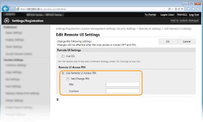 <Setări administrare sistem> <Setări IU la distanţă> <Setări securitate acces IU la distanţă> <Pornit> Introduceţi PIN-ul <Aplicare> Introduceţi PIN-ul (Confirmare) <Aplicare> .Dacă setările pentru IU la distanţă sunt iniţializateEste iniţializat şi PIN-ul de acces pentru IU la distanţă. După iniţializare, resetaţi codul PIN. Iniţializarea meniului