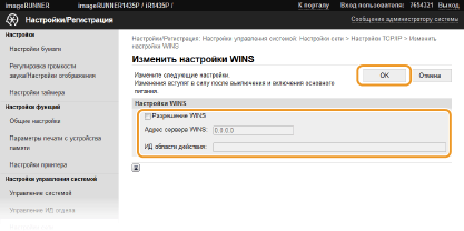 Установите флажок [Разрешение WINS], настройте необходимые параметры и нажмите [OK].