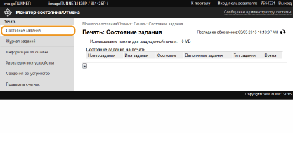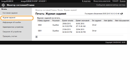 Отображается журнал печати. Можно просмотреть до 128 последних заданий.