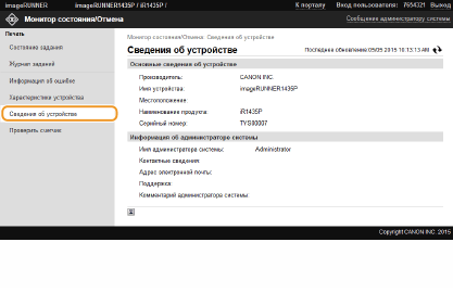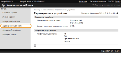 Отображается максимальная скорость печати и емкость памяти, доступной для защищенной печати. Кроме того, в пункте [Конфигурация устройства] отображается подключенное или активированное оборудование.