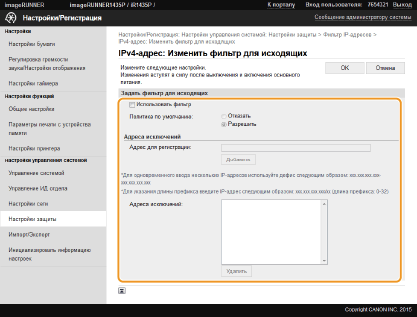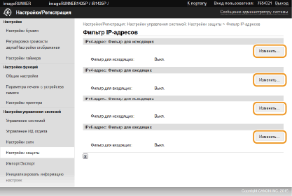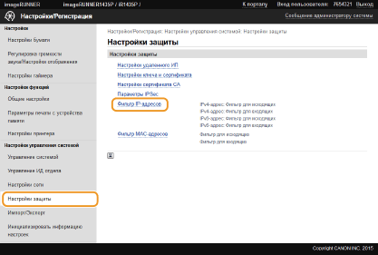 При неправильном вводе IP-адресов доступ к аппарату с удаленного ИП может быть заблокирован. В этом случае необходимо установить для параметра <Фильтр IPv4-адресов> или <Фильтр IPv6-адресов> значение <Выкл.>. Фильтр IPv4-адресов    Фильтр IPv6-адресов