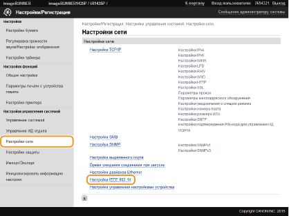Аппарат подключается к сети 802.1X в качестве клиентского устройства. Типичная сеть 802.1X включает сервер RADIUS (сервер аутентификации), коммутатор LAN (аутентификатор) и клиентские устройства с аутентификационным ПО (запрашивающие устройства). При подключении к сети стандарта 802.1X устройство должно пройти аутентификацию пользователя для подтверждения того, что подключение установлено авторизованным пользователем. Данные аутентификации передаются на сервер RADIUS для проверки. В зависимости от результатов этой проверки устройство может или не может быть подключено к сети. Если аутентификация не пройдена, коммутатор сети ЛВС блокирует доступ внешнего устройства к сети.