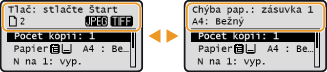 (Výber papiera/Nastavenia) vyberiete papier, ktorý chcete použiť v okne <Vybrať papier>. Toto tlačidlo môžete tiež stlačiť na zmenu nastavení papiera, keď vložíte papier s formátom alebo typom, ktorý sa líši od formátu alebo typu predtým vloženého papiera. Majte na pamäti, že nastavenie papiera musí byť špecifikované správne, aby sa papier podával správne.