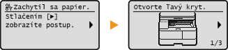 V niektorých prípadoch sa pri výskyte chyby zobrazia pokyny, čo máte robiť pri chybe. Problém vyriešite na obrazovke opísaným postupom. Nižšie je ako príklad zobrazené okno, ktoré sa zobrazí pri zachytení papiera (