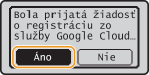 Stroj môžete zaregistrovať aj cez mobilné zariadenie alebo aplikáciu Google Chrome*. Na zariadení stroja sa pred dokončením registrácie zobrazí nasledujúca obrazovka s potvrdením. Stlačte <Áno>, čím dokončíte registráciu.