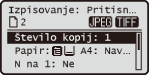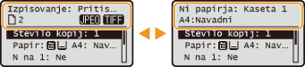 (Izbira papirja/Nastavitve) izberite papir, ki ga želite uporabiti, na zaslonu <Izbira papirja>. S to tipko lahko na primer tudi spremenite nastavitve papirja, če vložite papir drugačne velikosti ali vrste od predhodno vloženega papirja. Upoštevajte, da bo podajanje papirja potekalo pravilno samo, če boste nastavitev papirja izbrali pravilno.