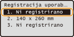 Registrirane velikosti papirja se prikažejo tudi, ko nastavite privzete nastavitve papirja za večnamenski podstavek. Na zaslonu lahko izberete eno od prikazanih velikosti kot privzeto velikost papirja za večnamenski podstavek. Registracija privzetih nastavitev papirja za večnamenski podstavek