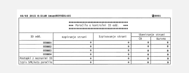 Če je omogočena funkcija Kontrolna ID, lahko za vsako ID oddelka izpišete poročilo o skupnem številu izpisanih strani. Poročilo omogoča nadzor uporabe in izboljšanje uporabe stroja.