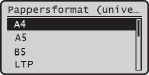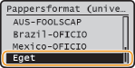 Om ovanstående skärm inte visas när papper fylls påOm du alltid fyller på samma papper i universalfacket, kan du hoppa över pappersinställningarna genom att registrera pappersformatet och typen som standardinställningar. När standardinställningarna har registrerats visas emellertid inte ovanstående skärm. Om du vill visa skärmen väljer du <Av> för <Reg. standardinst.> (Registrera universalfackets standardinställningar för papper).