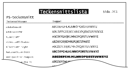 Du kan skriva ut en lista för att kontrollera vilka teckensnitt som är tillgängliga i PS-läge.