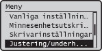Alla inställningar för justering och underhåll visas med korta beskrivningar. Standardinställningarna markeras med ett kors (