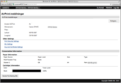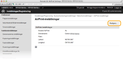 Du kan registrera information, däribland namn på enheten och installationsplats, som används för identifiering av enheten. Du kan även inaktivera AirPrint-funktionen för enheten. Använd fjärranvändargränssnittet för att ändra dessa inställningar.