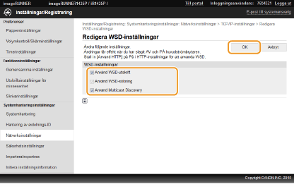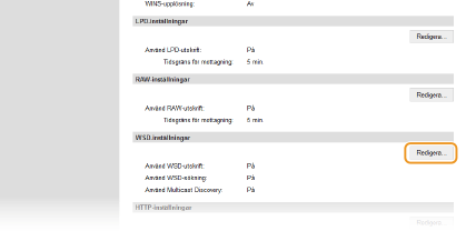 Markera kryssrutan för att hämta information om enheten från en dator via WSD. Kryssrutan markeras automatiskt när kryssrutan [Använd WSD-utskrift] är markerad. [Använd Multicast Discovery]