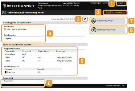 Visar aktuell status för enheten samt felinformation. Om ett fel inträffar visas länken till sidan [Felinformation].