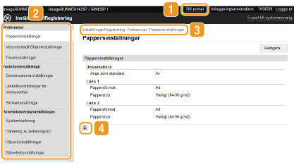 Visar sidan [Inställningar/Registrering]. När du har loggat in i systemhanteringsläget kan du ändra inställningarna och exportera/importera registrerade data.