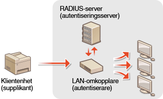 Enheten kan anslutas till ett 802.1X-nätverk som en klientenhet. Ett vanligt 802.1X-nätverk består av RADIUS-server (autentiseringsserver), nätverksswitch (autentiserare) och klientenheter med autentiseringsprogram (supplikanter). Om en enhet försöker ansluta till 802.1X-nätverket måste den gå igenom användarautentisering för att bevisa att anslutningen görs av en behörig användare. Autentiseringsinformationen skickas till och kontrolleras av en RADIUS-server, som tillåter eller avvisar kommunikation till nätverket beroende på autentiseringens resultat. Om autentiseringen misslyckas blockeras åtkomsten till nätverket av en nätverksswitch.