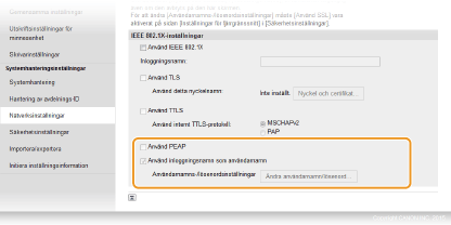 Markera kryssrutan [Använd IEEE 802.1X], ange inloggningsnamnet i textrutan [Inloggningsnamn:] och ange nödvändiga inställningar.