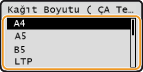Kağıt yüklendiğinde yukarıda gösterilen ekran görüntülenmezseÇok amaçlı tepsiye her zaman aynı kağıdı yüklerseniz, varsayılan ayar olarak kağıt boyutunu ve türünü kaydederek kağıt ayarı işlemlerini atlayabilirsiniz. Ancak varsayılan ayar kaydedildiğinde, yukarıda gösterilen ekran görüntülenmez. Ekranı görüntülemek için, <Varsayılan Ayarı Kydet> için <Kapalı> seçeneğini seçin (Çok Amaçlı Tepsi İçin Varsayılan Kağıt Ayarlarını Kaydetme).