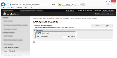 1 ile 60 dakika arasında bir zaman aralığı belirleyin. Makinenin sonraki baskı işini alabilmesi için, belirlenen zamanaşımı süresi tamamlandığında makine bir bilgisayardan gönderilen eksik baskı verisini siler. |