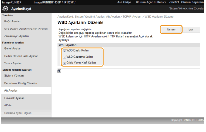WSD aracılığıyla bir bilgisayardan makine hakkında bilgi almak için onay kutusunu seçin. [WSD Baskı Kullan] onay kutusu seçildiğinde bu onay kutusu otomatik olarak seçilir. [Çoklu Yayın Keşfi Kullan]
