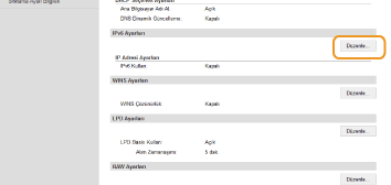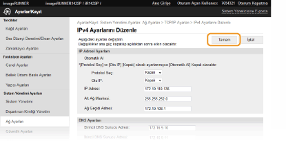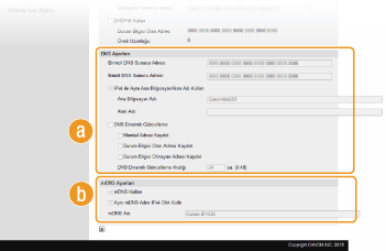 Makinenin IP adresi her değiştiğinde DNS kayıtlarını dinamik olarak güncellemek için onay kutusunu işaretleyin. DNS sunucusuna kaydetmek istediğiniz adres türlerini belirlemek için, [Manüel Adresi Kaydet], [Durum Bilgisi Olan Adresi Kaydet], veya [Durum Bilgisi Olmayan Adresi Kaydet] onay kutusunu seçin. Güncellemeler arasındaki aralığı belirlemek için [DNS Dinamik Güncelleme Aralığı:] metin kutusuna zamanı saat cinsinden girin. [mDNS Ayarları][mDNS Kullan]