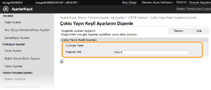 Makineyi, cihaz yönetimi yazılımı multicast discovery paketlerine yanıt verecek şekilde ayarlamak ve cihaz yönetimi yazılımı tarafından izlemeyi etkinleştirmek için onay kutusunu seçin. [Kapsam Adı:]