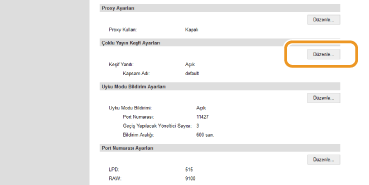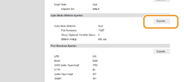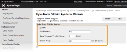Cihaz yönetimi yazılımına makinenin güç durumunu bildirmek için onay kutusunu seçin. [Bildir] seçildiğinde, makinenin uyku modundayken gereksiz iletişimi önlemesini ve toplam güç tüketiminin azaltılmasını bekleyebilirsiniz. [Port Numarası:]