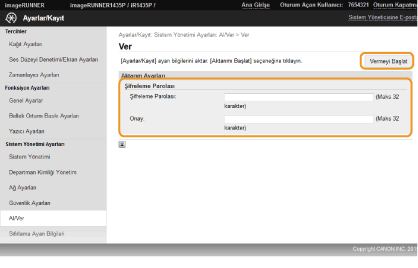 Şifreleme parolası için en fazla 32 alfasayısal karakter girin. Onay için, aynı parolayı [Onay:] metin kutusuna girin. Makineye veri aldığınızda bu parola gerekli olacaktır.