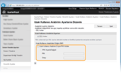 <Sistem Yönetimi Ayarları> <Uzak Kullanıcı Arabirimi Ayarları> <Uzak UI Erişimi Güvenlik Ayarları> <Açık> PIN'i Gir <Uygula> PIN'i Gir (Onayla) <Uygula> seçeneklerine basın.Uzak Kullanıcı Arabirimi ayarları başlatılırsaUzak Kullanıcı Arabirimi PIN'i de başlatılır. Başlatma sonrasında PIN'i sıfırlayın. Menünün Sıfırlanması