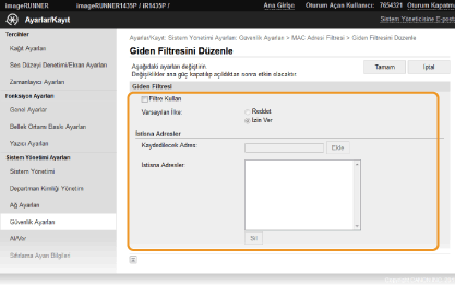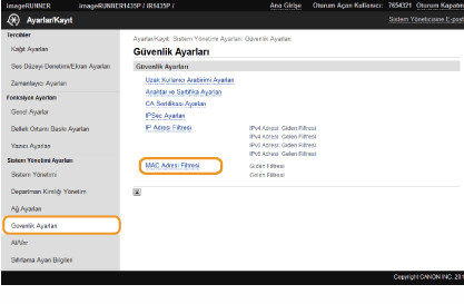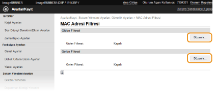 Giriş hatalarını kontrol edin MAC adresleri yanlış şekilde girildiyse, Uzak Kullanıcı Arabirimi'nden makineye erişemeyebilirsiniz ve bu durumda <MAC Adresi Filtresi> seçeneğini <Kapalı> olarak ayarlamanız gerekir. MAC Adresi Filtresi