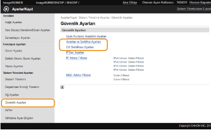 [Anahtar ve Sertifika Ayarları] (anahtar çiftleri için) veya [CA Sertifikası Ayarları] (CA sertifikaları için) seçeneğine tıklayın.