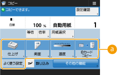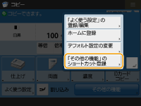 基本画面に配置できる設定項目の数や表示位置は、機能によって異なります。 ショートカットとして<割り当てなし>を登録した場合はショートカットボタンは表示されません。 <その他の機能>のショートカットとして登録可能なボタンの上限数は以下のとおりです。 コピー:5 ファクス:4 スキャンして送信:2 |