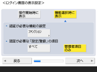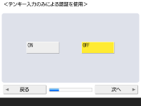本機のセキュリティーを高めるために、ユーザー認証を使用する体制で運用してください。 ![]() ![]() <ユーザー認証を使用>の<ON>を押して使用するログイン方法の<ON>を押し、<次へ>を押します。 ユーザー認証を使用しない場合は、<ユーザー認証を使用>の<OFF>を押したあと<OK>を押し、Step 6へ進みます。 ![]() 本機に「Administrator」ユーザー以外に管理者が登録されていない場合は、次の設定を行います ![]() 本機のセキュリティーを高めるため、新規に管理者を登録して「Administrator」ユーザーを無効にする場合は、<はい>を押します。<管理者ユーザーの登録>で<ユーザー名>、<パスワード>を押してそれぞれ入力し、<OK>を押します。必要に応じて<Eメールアドレス>、<部門ID>、<表示名>を設定してください。詳しくは、ローカルデバイスにユーザー情報を登録するを参照してください。「Administrator」ユーザーは次回ログイン時から無効になります。 「Administrator」ユーザーで運用する場合は、<いいえ>を押します。 ![]() ![]() ログイン画面を表示するタイミングを選びます。<機能選択時に表示>を選んだ場合は、<ファンクション>を押して、ログイン画面を表示させる機能を選び、<OK>を押します。また、<設定/登録>画面でどの項目を設定するときにログイン画面を表示させるかを選びます。 <シンプルログイン>と<キーボード認証>を<OFF>にした場合は、<OK>を押します。Step 6へ進みます。 <シンプルログイン>または<キーボード認証>を<ON>にした場合は、<次へ>を押します。 ![]() ![]() ログイン画面でテンキー入力のみによる認証を使用する場合は、<ON>を押します。 <シンプルログイン>を<OFF>にした場合は、<OK>を押します。Step 6へ進みます。 <シンプルログイン>を<ON>にした場合は、<次へ>を押します。 ![]() ![]() シンプルログインで暗証番号の入力を強制したい場合は<ON>/強制しない場合は<OFF>を押し、<次へ>を押します。 ![]() ![]() プリント機能に適した状態でシンプルログインを使用したい場合は、<ON>を押します。強制留め置き印刷が有効になり、パソコンからの印刷データを利用してユーザー登録したり、プリントするユーザーに適したログイン画面をデフォルト表示にしたりする設定になります。詳しくは、強制留め置き印刷の設定をする、<ユーザーの登録方法>、<シンプルログイン画面のデフォルト表示の変更>を参照してください。 ![]() ![]() シンプルログイン画面のプリセットボタン数を選び、<OK>を押します。 本機はログインサービスにUser Authentication(個人認証管理)を使用する設定になっています。詳しくは、個人認証管理を開始するを参照してください。 | |