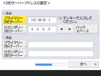DNSサーバーアドレスやDNSのホスト名/ドメイン名などを設定します。 ![]() ![]() <プライマリーDNSサーバー>、<セカンダリーDNSサーバー>を押して、DNSサーバーのIPv4/IPv6アドレスを入力し、<次へ>を押します。 DNSサーバーアドレスの設定などについて詳細は、DNSの設定をするを参照してください。 ![]() ![]() <ホスト名>を押して本機の名称(ホスト名)を、<ドメイン名>を押して本機が属するネットワークドメイン名を入力し、<次へ>を押します。 IPv4とIPv6が同じ設定になる場合は、<IPv4と同じホスト名/ドメイン名を使用>の<ON>を押してください。 ![]() ![]() DNSの動的更新で自動登録する場合は、<DNSの動的更新>を<ON>にして、<OK>を押します。 <IPv6>の<DNSの動的更新>を<ON>にした場合は、自動登録する項目を<ON>にします。 | |