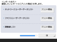 ネットワークユーザーリスト、ファクスユーザーデータリスト、調整値リストをプリントできます。 ![]() ![]() 出力したいレポートの<プリント開始>を押すと、リストがプリントされます。 リストのプリント完了後やリストをプリントしないときは、<OK>を押します。 | |