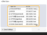 1 | Select the paper source in which paper is loaded and press <Other Size>. |