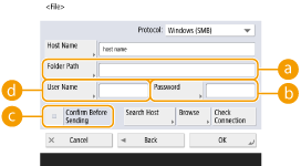 1 | Enter the host name of the file server/Advanced Box which transmits data. ![]() Ask your Network administrator about the information on the file server/Advanced Box. <Protocol>Select a protocol for the file server from <Windows (SMB)>, <FTP> and <WebDAV>. When sending a document to the Advanced Box, select <Windows (SMB)> or <WebDAV>. ![]() If you select <Windows (SMB)>, the <Search Host> and <Browse> buttons are displayed. You can easily specify a file server/Advanced Box by searching or viewing the network. You can register up to five Directory servers used in <Browse>. <Host Name>Enter the host name of the file server/Advanced Box. When sending a document to the Advanced Box, enter <Host Name> as follows. If you select <Windows (SMB)> for the protocol Example: To save to the Shared Space: \\192.168.100.50\share To save to the Personal Space: \\192.168.100.50\users If you select <WebDAV> for protocol, enter <Host Name> as follows and press <Next>. When TLS is disabled Example: To save to the Shared Space: http://<IP address or host name>/ To save to the Personal Space: http://<IP address or host name>/ When TLS is enabled Example: To save to the Shared Space: https://<IP address or host name>/ To save to the Personal Space: https://<IP address or host name>/ <Check Connection>Press this button after entering the host name to confirm the connection with the file server/Advanced Box. ![]() If you are using a login service such as personal authentication management, it is necessary to enter <User Name> and <Password>. |