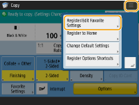 If you use the same settings every time for the Copy, Fax, or Scan function or want to save complicated settings, you can register settings as favorite settings, which can then be conveniently recalled.
