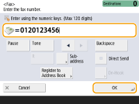 To send faxes overseasEnter the international access number, the country code, and the fax number, in that order. If you cannot successfully connect to the destination overseas, press <Pause> to insert a pause between a number and the next number. To send faxes with a subaddressThe machine supports the use of ITU-T* standard subaddresses. If the recipient's fax machine is compatible with the use of ITU-T subaddresses, you can enhance the confidentiality of sent documents using a subaddress and password. To send a document with a subaddress, enter a fax number, press <Subaddress> or <Set Details>, and then enter the subaddress and password. * Stands for International Telecommunication Union-Telecommunication Standardization Sector, which is the group that makes recommendations towards the standardization of worldwide telecommunications. |